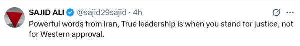 این سخنان قدرتمند از ایران بود، رهبری واقعی زمانی است که شما از عدالت حمایت میکنید، نه این که به دنیال تایید غرب باشید.