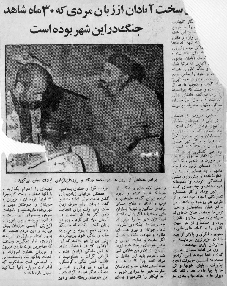 کاری به این ندارم که قبل از انقلاب، «مصطفی» که بود و چه کاره بود. (که به گواه افراد صادقالقول و صالحالعمل: بد هم نبود). خیلی از «شهاب و طاهر» هم شناختی ندارم. ولی شاید این جمله معروف حضرت امام خمینی (ره) که در آخرین بند از وصیتنامه سیاسی-الهیشان آمده است، بتواند راهگشای خوبی باشد: «میزان و ملاک، حال فعلی افراد است…» او را در دوران جنگ بیشتر باید شناخت: حضور داوطلبانه در خطوط مقدّم جبهه نبرد، در شهر محاصره شده آبادان؛ اشتغال به امور فنّی اداره آب و برق، بی هیچگونه چشمداشت و مزدی؛ و در کلّ انجام هر کاری که روحیهبخش برای مردم و ساکنین در شهر بود. به گواه رزمندگان آبادان: نه نماز جمعهاش ترک شد، و نه حضورش در تشییع پیکرهای مطهّر شهدای شهر. اینجایش را اصلاً کسی نشنیده! : همسر و فرزند ارشدش را نیز به دلیل اثرات ناشی از بمباران شیمیایی شهر (که در دی ماه ۱۳۶۵ و در جریان عملیّات کربلای پنج توسط ارتش عراق انجام شد) از دست داد! حتّی شهادت برادرزاده برومندش «بسیجی شهید محمّد سرآندیب» هم خم به ابرویش نیاورد…