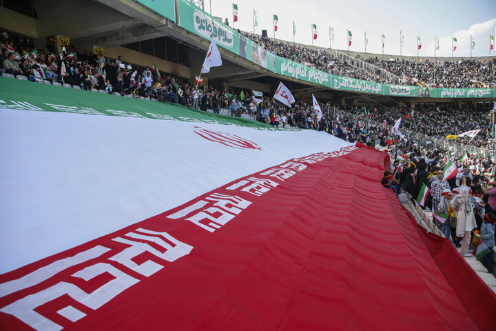 تمام جایگاههای طبقه اول و سه چهارم جایگاههای طبقه دوم ورزشگاه آزادی پر شده و جمعیت حاضر در این استادیوم تاریخی در حال اجرای سرود هستند.