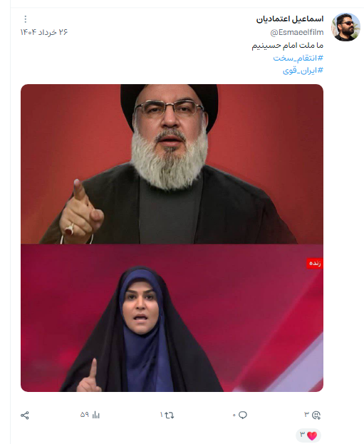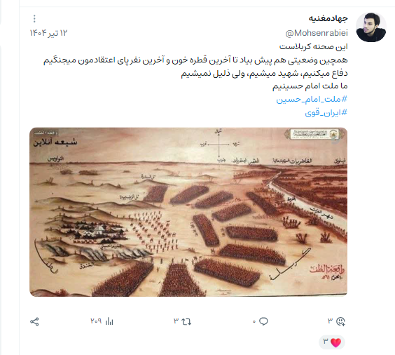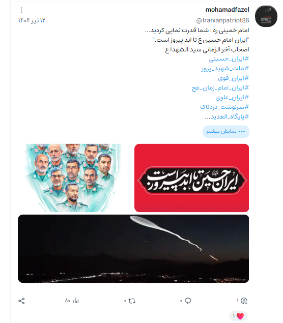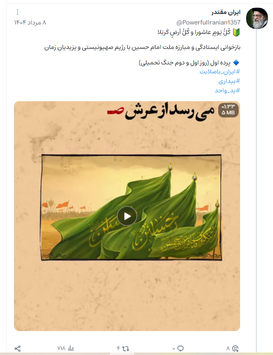 ندای عارفانه و سرشار از درایت و فهم سردار دلاورمان، شهید حاج قاسم سلیمانی که گفتند ما ملت شهادتیم، ما ملت امام حسینیم را هنوز به یاد داریم و به وضوح دیدیم در همین جنگ 12 روزه اخیر جوانان شجاع و فرزندان سرافراز ایران زمین در نیروهای مسلح چگونه مقتدرانه ، حسین وار به مبارزه با دشمن تا بن دندان مسلح آمریکایی و صهیونیستی یورش آورده و پاسخی دندان شکن به تجاوز آشکار آنها به وطن را دادند به گونه ای که تنها پس از 12 روز ندای التماس از گلوی سگ زرد آمریکایی بیرون آمده و فریاد آتش بس زد تا لاشه له شده رژیم صهیونی را از مرگ و نابودی حتمی نجات دهد.