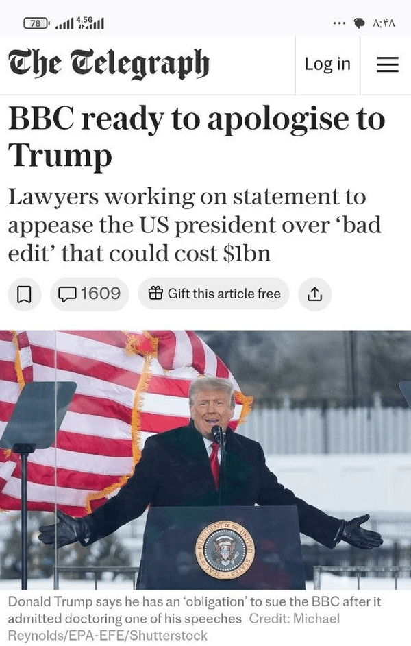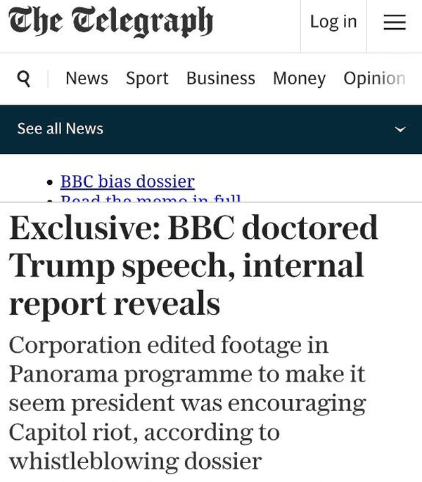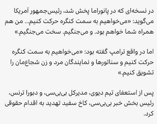 ماجرای شکایت ترامپ از بی بی سی از هفته گذشته و زمانی آغاز شد که روزنامه تلگراف یادداشتی درز شده را منتشر کرد که در آن از یک مستند برنامه پانورامای بیبیسی و نحوه ویرایش سخنرانی ترامپ در ژانویه ۲۰۲۱، روز حمله به کنگره آمریکا، انتقاد شده بود.روزنامه تلگراف که افشاگر تحریف بیبیسی است، مینویسد: « یک برنامه پانوراما که یک هفته قبل از انتخابات آمریکا پخش شد، بینندگان را «کاملاً گمراه» کرد و نشان داد که رئیس جمهور به هوادارانش میگوید که قرار است با آنها تا ساختمان کنگره پیادهروی کند تا «به سختی بجنگند»، در حالی که در واقع او گفته بود که با آنها پیادهروی خواهد کرد تا «به طور مسالمتآمیز و میهنپرستانه صدای شما را به گوش دیگران برساند.»