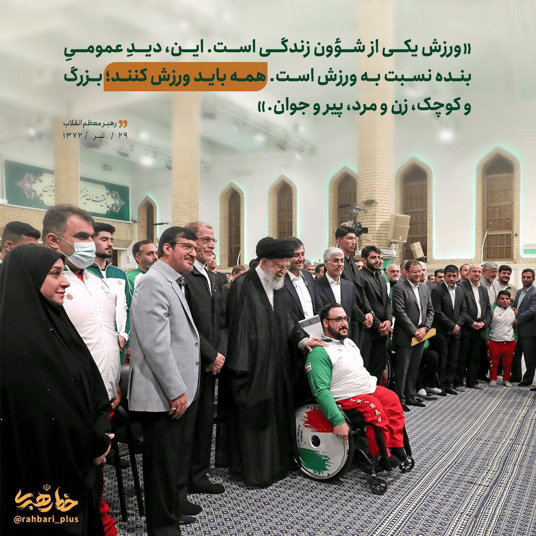 تماشای صحنههای افتخارآفرینی ورزشکاران ایرانی در عرصههای جهانی، همچون تزریق نشاط و امید به دل هر ایرانی است که قلبش برای کشور میتپد. این موفقیتها نه تنها دل هموطنان را شاد میکند، بلکه پیروزی ورزشکاران ایران میتواند دل میلیونها انسان با ملیتهای مختلف، چه مسلمان و چه غیرمسلمان، را نیز لبریز از شادمانی کند: «در یکی از این مسابقات ورزشی ما... در چند کشور اسلامی از کشورهای عربی... بهمجرداینکه دیدند ایران پیروز شد، شروع کردند جشن و پایکوبی در خیابان در منظر عام که ایران مثلاً بر فلان کشور قدرتمند سیاسی موذی خبیث پیروز شد!» ۱۴۰۱/۰۶/۲۰