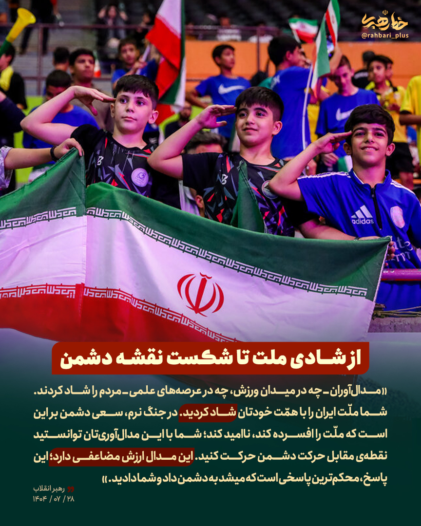 از آنجایی که در شرایط جنگ نرم قرار داریم و در این: «جنگ نرم، سعی دشمن بر این است که ملّت را افسرده کند، ناامید کند، او را از تواناییهای خودش مأیوس کند.» ۱۴۰۴/۰۷/۲۸ در گیرودار جنگ نرم، مدالآوران ایرانی توانستند با ایستادگی و اراده مقابل تلاشهای دشمن بایستند و پیام نشاط و پیروزی در میادین بینالمللی را به جامعه منتقل کنند؛ پیامی که علیرغم برنامهریزی گسترده دستگاههایی از سراسر جهان برای ناامیدسازی ایرانیان به ویژه جوانان، به گوش رسید. اهمیت این دستاوردها در شرایطی که جبهه استکبار از هر موفقیت ایران خشمگین میشود و تلاشهایش بینتیجه میماند، دوچندان است؛ زیرا قهرمانان با پیروزیهای خود ثابت میکنند که «کارهایی که بهظاهر نشدنی است، در واقعشدنی است... این پیام برای دوران ما بسیار ارزشمند است.» ۱۴۰۰/۰۶/۲۷